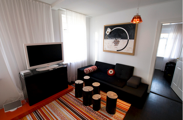 As the subtitle suggests, a trendy apartment calls for window blinds instead of curtains. Vertical and venetian blinds will suit almost every setting and will not make the room feel closed in, the way that heavy drapes do.